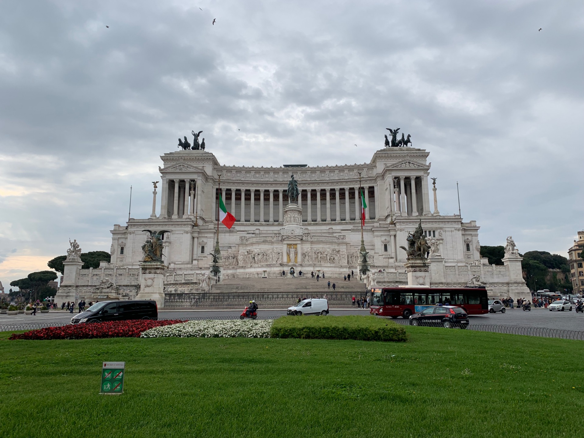 Z těchto fotek to těžko uvidíte, ale uprostřed je jezdecká socha krále V. Emanuela II. Dále široké schodiště vede k soše Říma, odkud zprava vede průvod lásky k vlasti, a zleva průvod na oslavu práce. Kromě toho uprostřed hoří oheň.